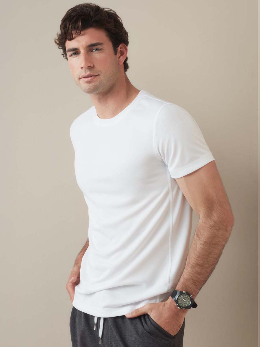 Nowoczesne i elastyczne sportowe T-shirty dla mężczyzn wykonane z szybkoschnącej i oddychającej siateczki. Taśma w kontrastującym kolorze na karku, dekoracyjne szerokie szwy i pełna swoboda ruchu.