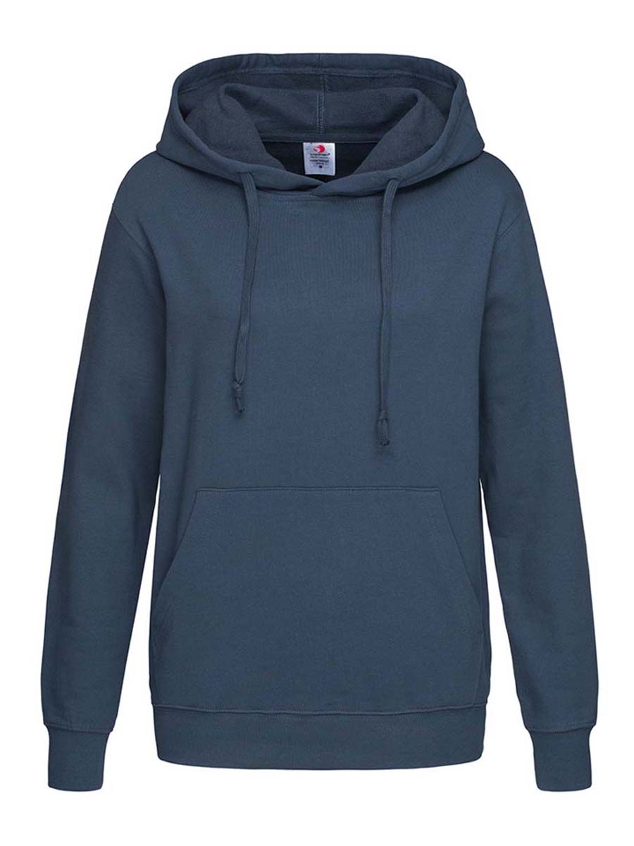 A durable ring-spun cotton-polyester-blend: midweight hooded sweatshirt for women, brushed inside with kangaroo pocket, elastic cuffs and waistband.